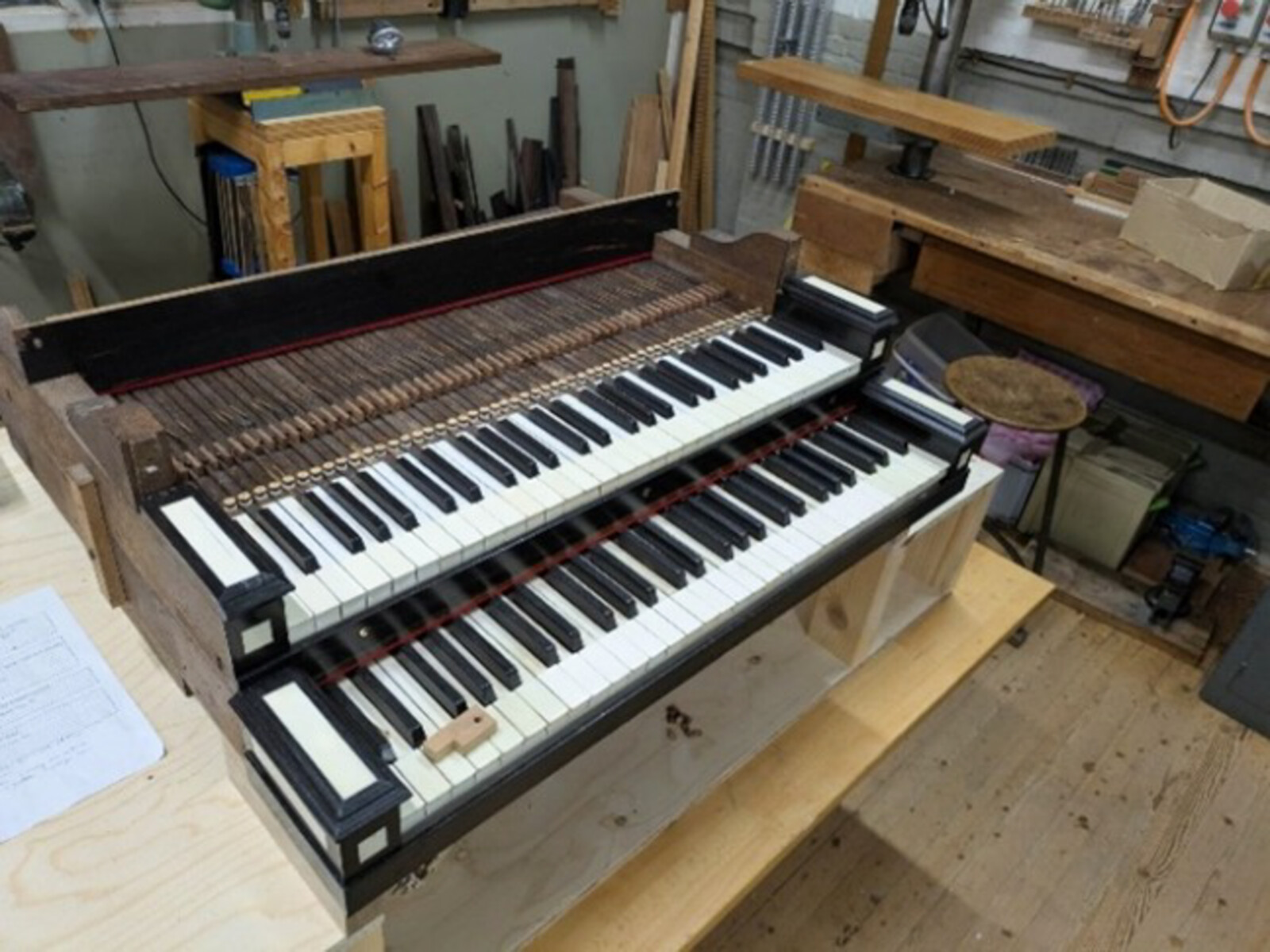 Er wordt flink aan het orgel gewerkt in de kerk! De windvoorziening is inmiddels aangelegd, de luchtkanalen en conducten liggen weer op hun plek. Ook is het mechaniek aangesloten op de windladen, zodra het klavier weer op z’n plek ligt kunnen de latjes en geleidestangetjes, abstracten genaamd, met de toetsen verbonden worden. De klavieren zijn inmiddels gerestaureerd, maar nog in de werkplaats. Het nieuwe pedaalklavier is ook klaar, omdat de maatvoering enigszins gewijzigd is heeft de orgelmaker een nieuw walsbord moeten maken, een soort schakelbord van scharnierende winkelhaken die de toetsen van het pedaal en de abstracten met elkaar verbinden.