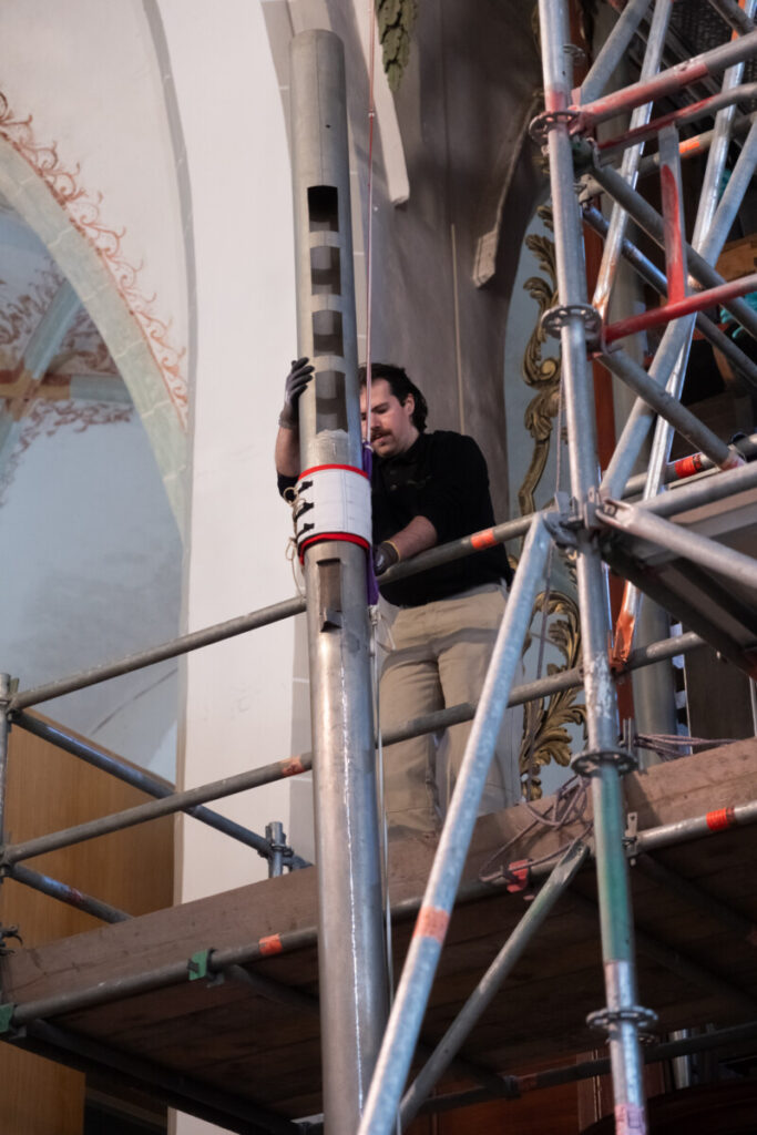 De maand november zal grotendeels in het teken staan van het intoneren. Dat betekent dat het gehele pijpwerk wordt nagelopen en waar nodig bijgesteld worden zodat elke pijp op z’n best klinkt. Belangrijke wijziging zal hoorbaar zijn in het register fagot/klarinet. Dit zogenaamde tongwerk register van het bovenwerk is bij de vorige restauratie in de jaren 50 door een technische aanpassing van klank veranderd. Van Oeckelen heeft dit register geleverd met een relatief milde klank. Dit register had na de restauratie volgens de (neo)barokke klankidealen van die tijd een veel scherpere klank gekregen. Persoonlijke noot: ik vond dit register eigenlijk altijd wat snaterig klinken en moeilijk in te passen in de literatuur die bij dit orgel past. Bij de afgelopen deelrestauraties is er nog voor gekozen dit register ongewijzigd te laten, nu wordt deze teruggebracht in originele staat. Deze aanpassing in combinatie met de herstelde windvoorziening moet wel een hernieuwde klank opleveren, we zijn benieuwd!